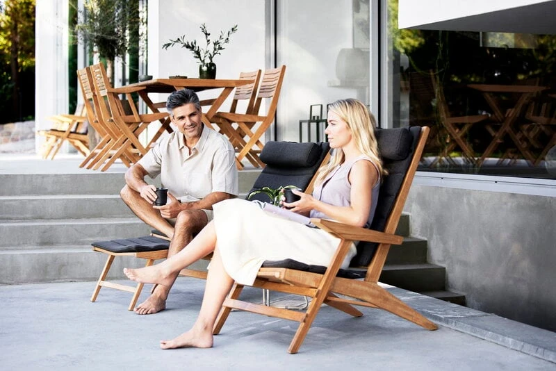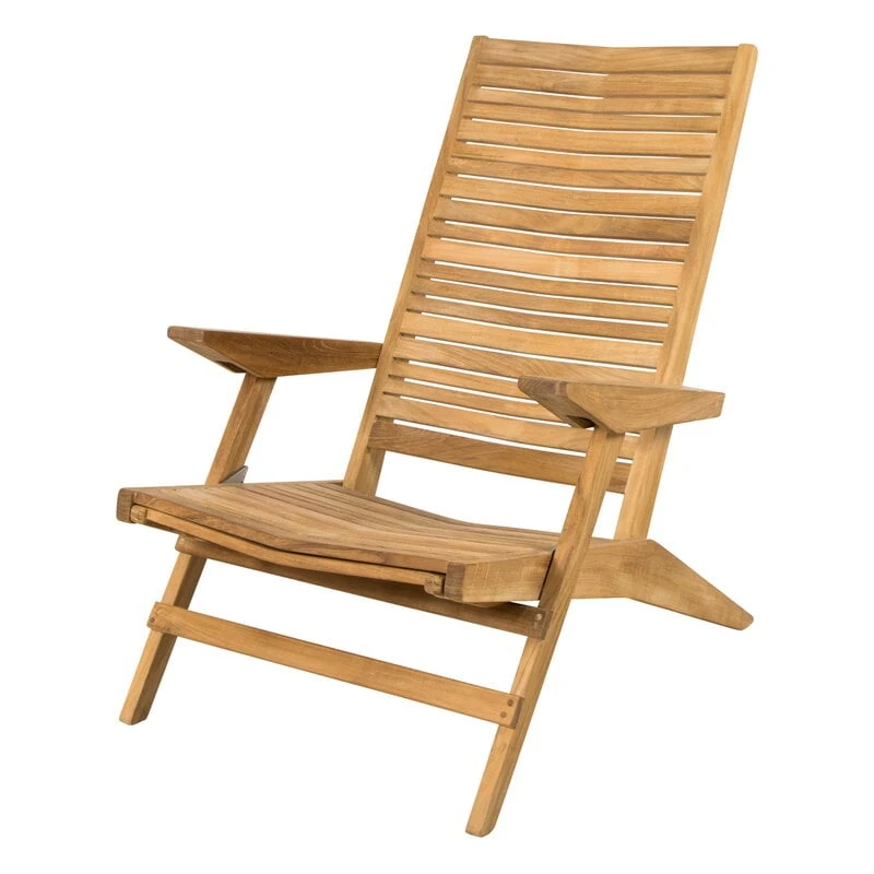 Cane-line’s Flip deck chair, designed by the Danish duo Strand+Hvass, is a teak wood patio chair with a sculptural design and distinctive seat slightly bent in the middle. Thanks to the folding backrest, you can easily adjust the seat angle to your liking, and the footrest can easily be pushed under the seat when not in use.