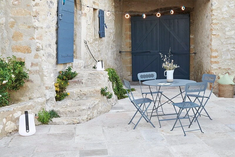 Balad H25 lamp by Fermob can be placed on the garden table, tree branch or inside the house. The cordless table lamp has two different lighting intensities and three colour temperatures. Combined with the separately sold upright stand, Balad will turn into a stylish floor lamp.