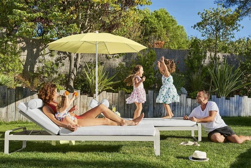 Fermob’s Bellevie Premium sunlounger is so cosy that you don’t want to get out of it at all. The gently curved chair has three different positions, so you can adjust it to suit whatever you’re doing at the moment: lower the backrest when you’re taking a nap in the sun, or raise it slightly when you want to sip mocktails and cocktails or read a book. The Bellevie recliner is very hard-wearing even at the mercy of fickle weather: its frame is made of light but durable aluminium, and the mattress is made from extremely comfortable and flexible polyurethane foam and upholstered in dirt-repellent, UV-protected Sunbrella fabric. Although the fabric can withstand some water and moisture, please store the mattress indoors during heavy rain and other bad weather.