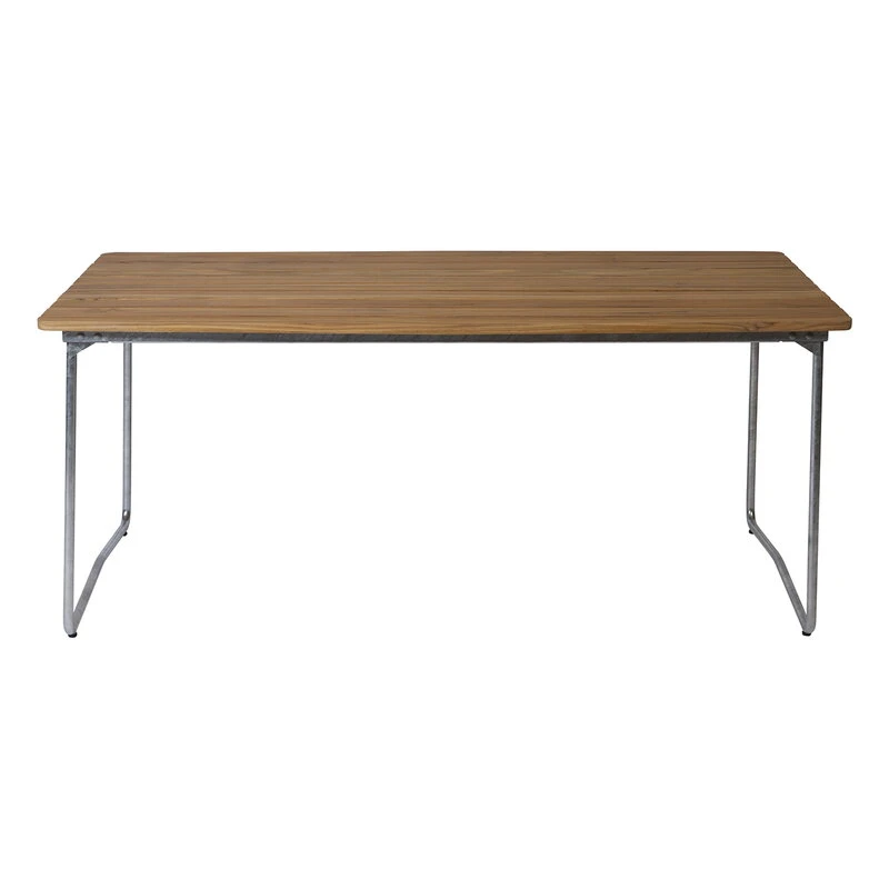 Grythyttan Stålmöbler’s table B31 is an attractive and hardwearing outdoor table that pairs a steel base with a long, rectangular teak wood top. Designed by Artur Lindqvist in the 1950s, this table is ideal for approximately 6 people, and its foldable base allows it to be stored and transported in as narrow a space as possible. Over time, the galvanized steel parts will acquire a matte surface, while the untreated teak wood will develop a beautiful silver-grey patina.