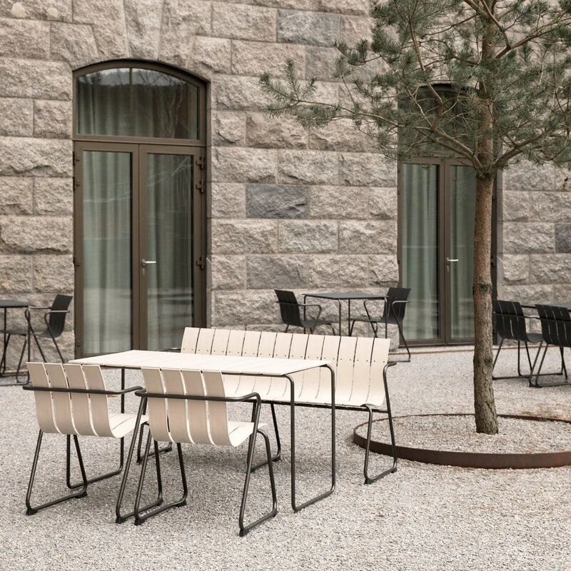 The Ocean garden bench by the Danish Mater is a reinterpretation of the outdoor furniture range designed by Nanna & Jørgen Ditzel in 1955. Besides the exceptionally harmonious form, also the materials make the Ocean range very unique: the collection has been made using ocean waste plastic and recycled fishnets. The seats and tabletops are formed by strong plastic slats, and the airy design is complemented by grey-coated metal frames. All the components are recyclable. The Ocean collection received the Wallpaper* design award in 2019.