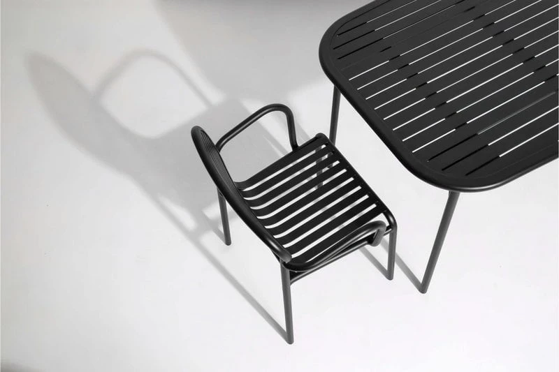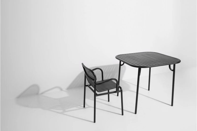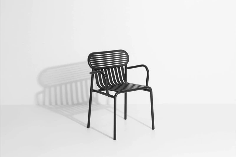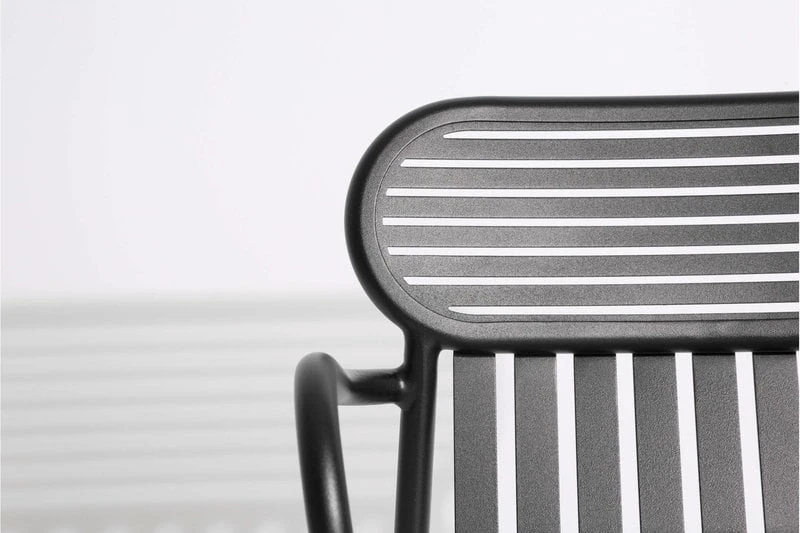 The Week-end bridge chair is part of Petite Friture’s collection of aluminium outdoor furniture. The attractive armchair is characterized by oval shapes and both horizontal and vertical slats on the backrest. All the chairs of the Week-end range are stackable.