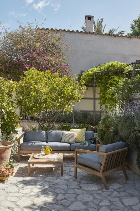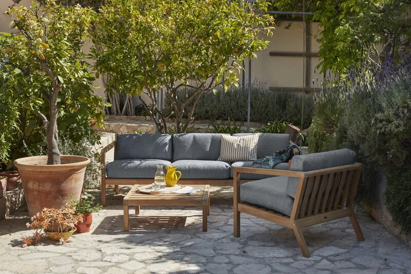 Skagerak’s Virkelyst sofa is so comfortable that you could easily think it’s designed for indoor use. However, the three-seater sofa, consisting of a minimalist teak frame and plush cushions, is specially designed for outdoors and its upholstery is therefore very durable as well as water and dirt resistant. The hypoallergenic Fossflakes inside the cushions are known as a very breathable padding material that maintains its shape over time. .